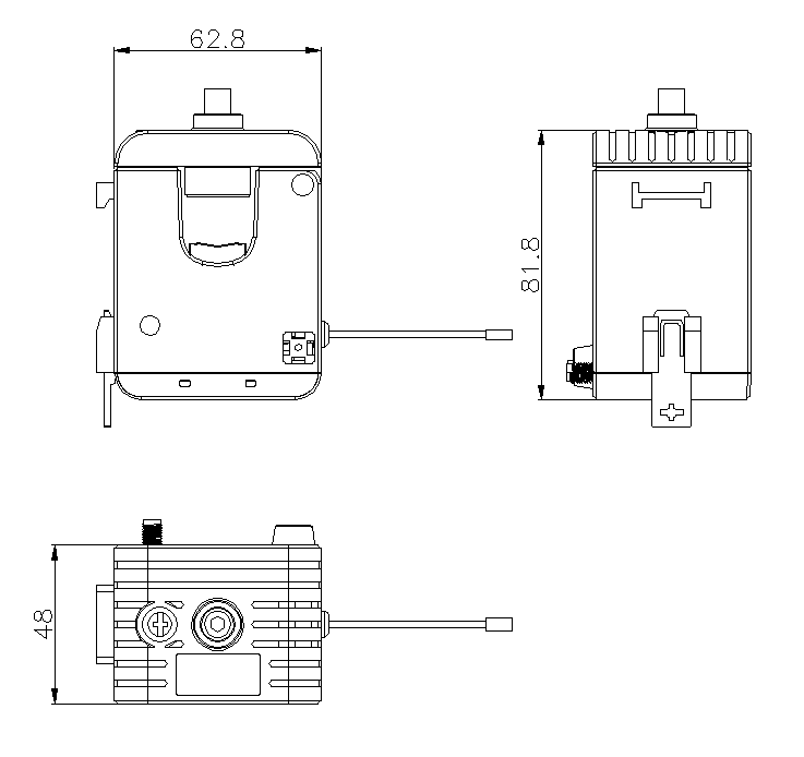 終端外形尺寸為62.8mm×48mm×81.8mm;終端采用開口式設(shè)計,可安裝在直徑為(6~15mm)的線纜上。
