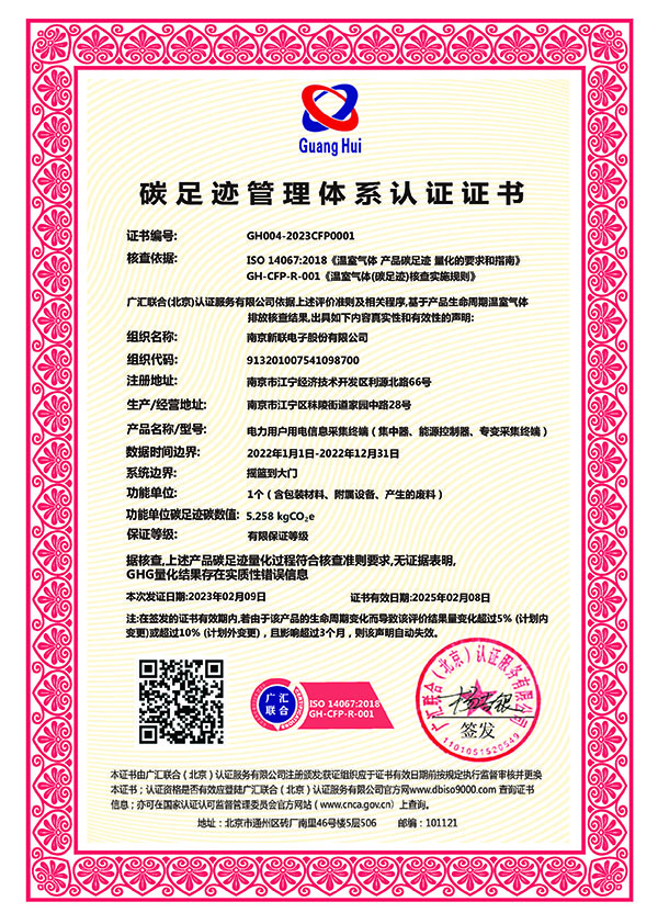 近日,新聯(lián)電子電力用戶用電信息采集終端(集中器、能源控制器、專變采集終端)系列產品順利通過認證專家組審核,獲得碳足跡管理體系認證證書。本次認證依據(jù)ISO 14067:2018《溫室氣體 產品碳足跡 量化的要求和指南》、GH-CFP-R-001《溫室氣體(碳足跡)核查實施規(guī)則》等相關標準及文件,反映了產品的環(huán)境友好程度,助推公司綠色低碳高質量發(fā)展。