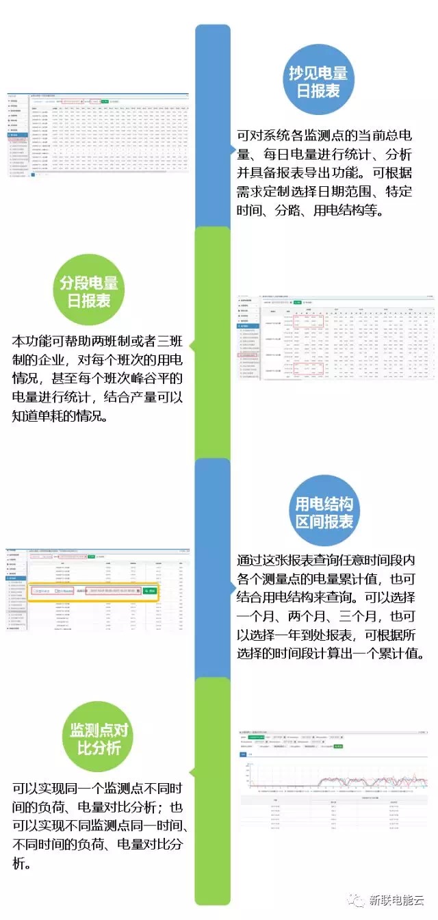 使用新聯(lián)電能云配用電監(jiān)測與管理系統(tǒng),即可免費使用統(tǒng)計報表功能,除此之外,配用電監(jiān)測與管理系統(tǒng)還可為企業(yè)提供多項用電管理功能,幫助企業(yè)實現(xiàn)精細化、自動化管理。在保證安全用電的基礎上企業(yè)可根據(jù)經(jīng)濟運行、能效管理的要求設置管理目標,通過系統(tǒng)實現(xiàn)企業(yè)用電管理的高效運行。