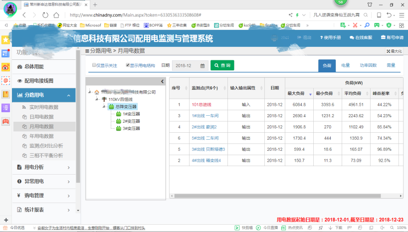 某公司2018年用電將達(dá)到3150萬(wàn)千瓦時(shí),新申達(dá)信息科技有限公司(全部園區(qū)企業(yè))用電將達(dá)到4200萬(wàn)千瓦時(shí)。公司于2015年起就與新聯(lián)電子合作上馬了配用電監(jiān)測(cè)與管理系統(tǒng)并簽訂協(xié)議。高低壓監(jiān)測(cè)總計(jì)18路,其中110KV高壓配電總進(jìn)線1路,10KV出線5路,低壓側(cè)12路,基本上都是輔助設(shè)備如冷凍機(jī)、空壓機(jī)、粉碎機(jī)和造粒機(jī)等。輔助設(shè)備可以根據(jù)生產(chǎn)情況控制在平、谷開(kāi)啟,達(dá)到降低電費(fèi)支出的目的。下圖是配用電監(jiān)測(cè)線路圖: